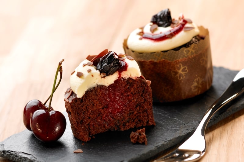 A chocolate sponge, filled with a tart cherry jam, topped with smooth buttercream and sprinkled with chocolate flakes. Finished with a cherry.